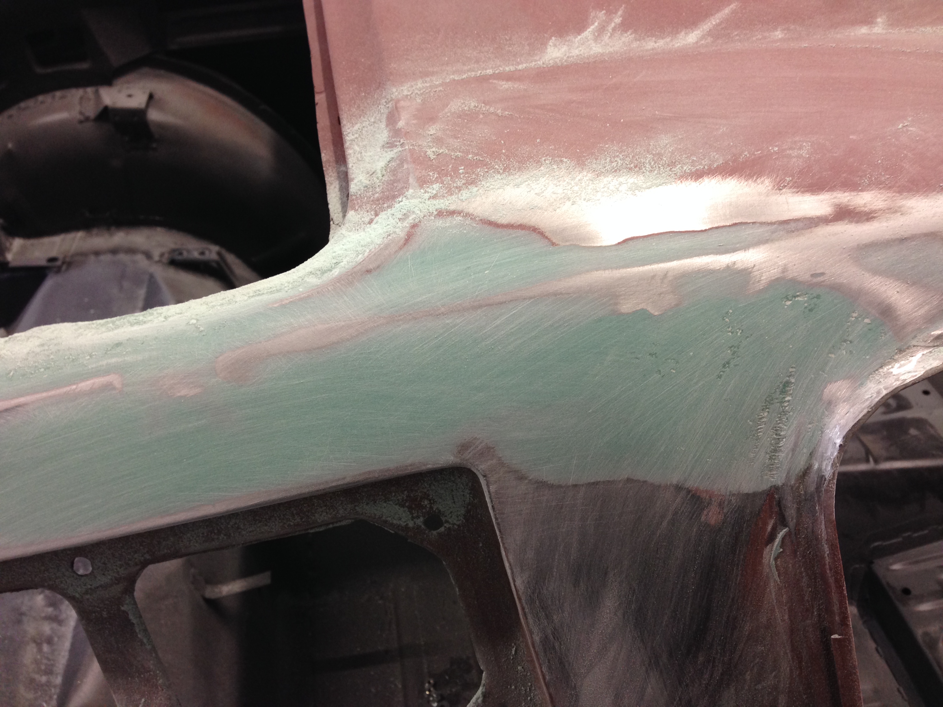 Natürlich ging es auch wieder mal an die Quarter Panel Extensions, eine weitere Schicht Spachtel auf der Beifahrerseite war nötig.